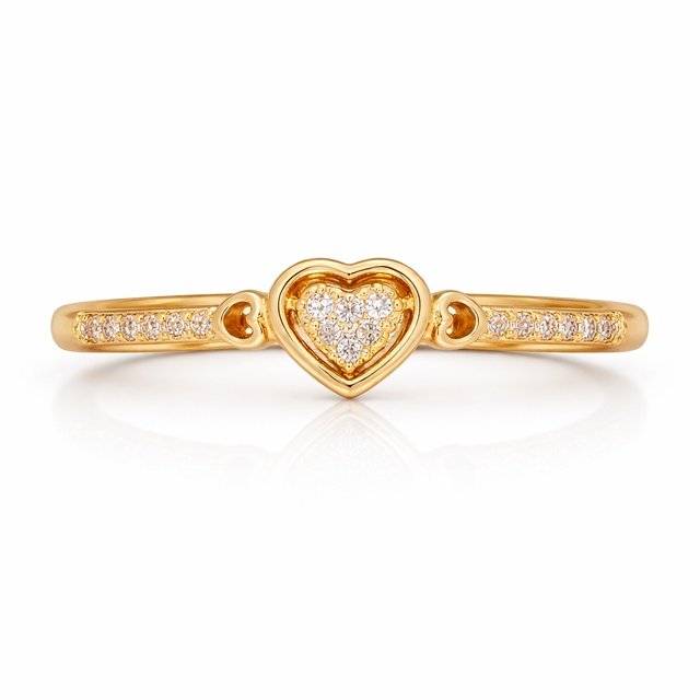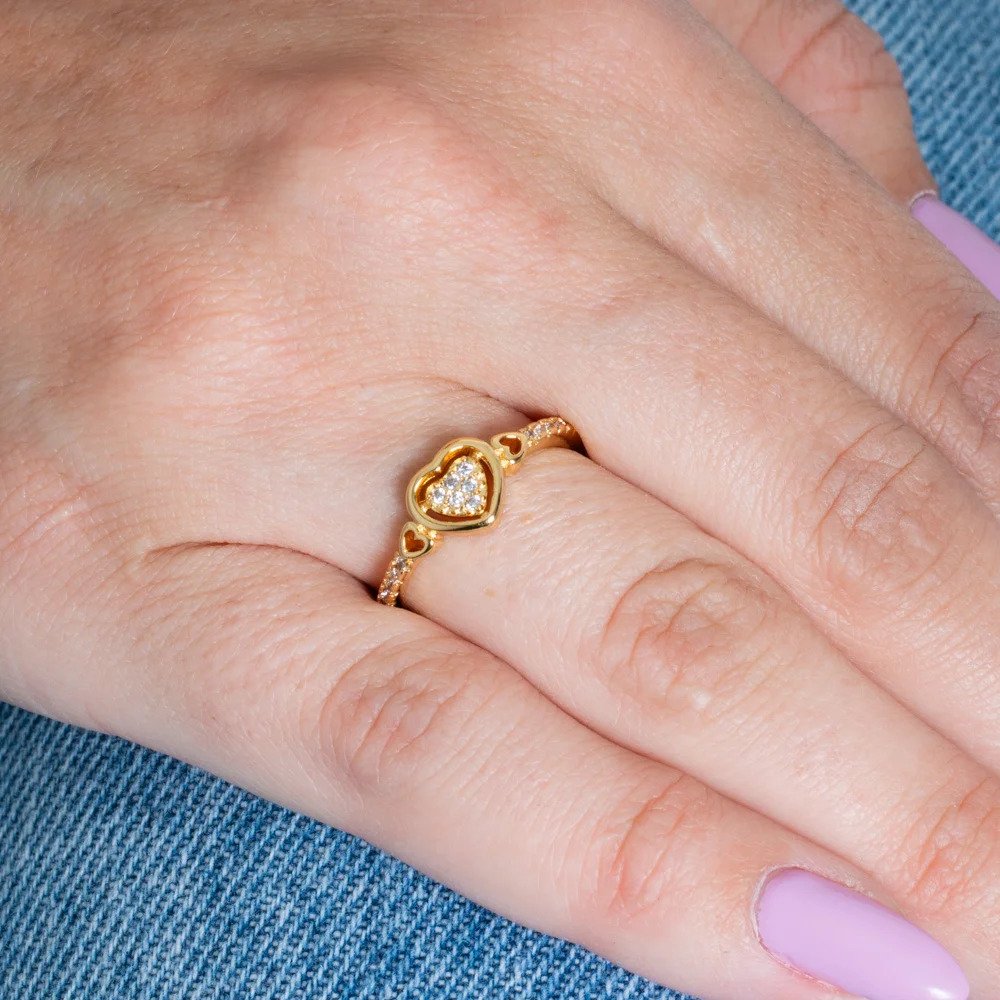 Anel delicado com coração central vazado, preenchido por zircônias cravejadas que proporcionam brilho elegante e romântico. As laterais do aro contam com pequenos detalhes em zircônia e mini corações vazados, valorizando ainda mais o design feminino e sofisticado da peça.