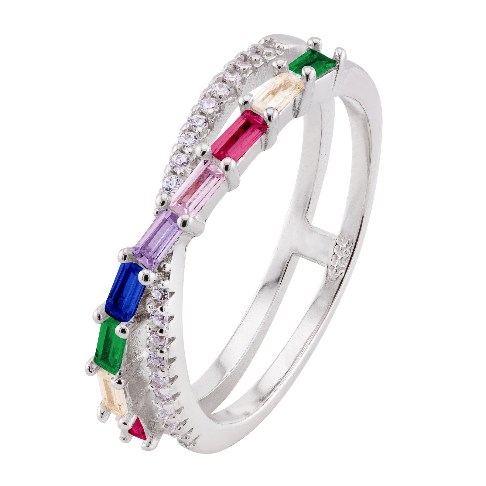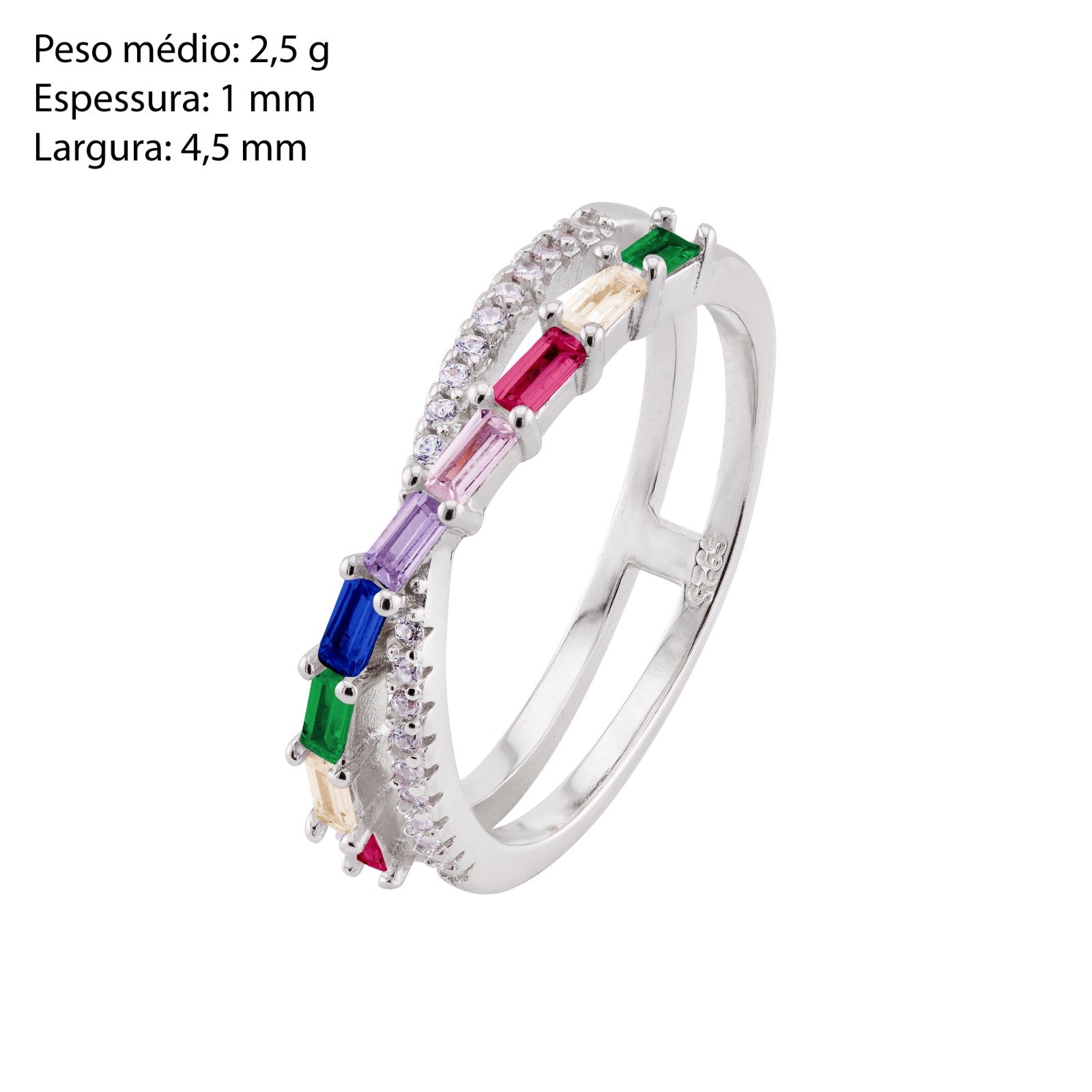 Anel em Prata 925 com Zircônias Coloridas em Lapidação Retangular, uma joia moderna e cheia de personalidade. O design apresenta uma sequência harmoniosa de zircônias coloridas em lapidação baguete, criando um visual vibrante e sofisticado. As laterais do aro são delicadamente cravejadas com zircônias cristal, garantindo brilho extra e um acabamento refinado.