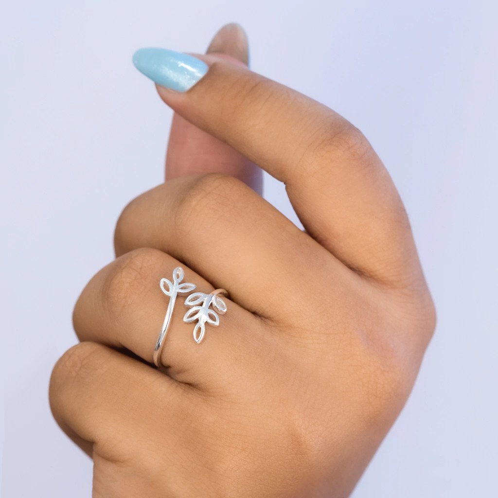 Anel em Prata 925 com Design de Folhas, uma joia delicada e inspirada na natureza. O aro aberto valoriza o visual moderno e ajustável, enquanto o detalhe em folhas vazadas traz leveza e um toque orgânico ao design, resultando em uma peça elegante e atemporal.