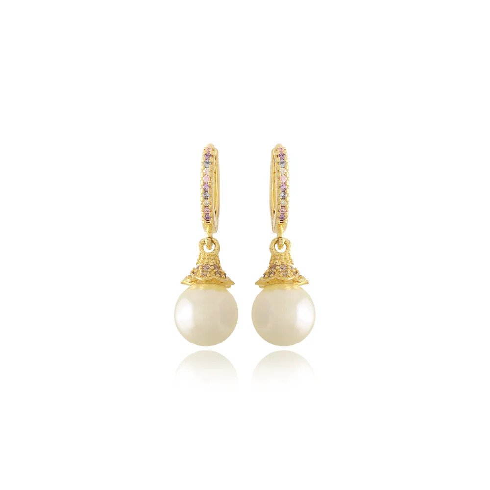 Brinco Argola com Pérola Sintética e Detalhes Cravejados – Semi Joia Banhada a Ouro 18K