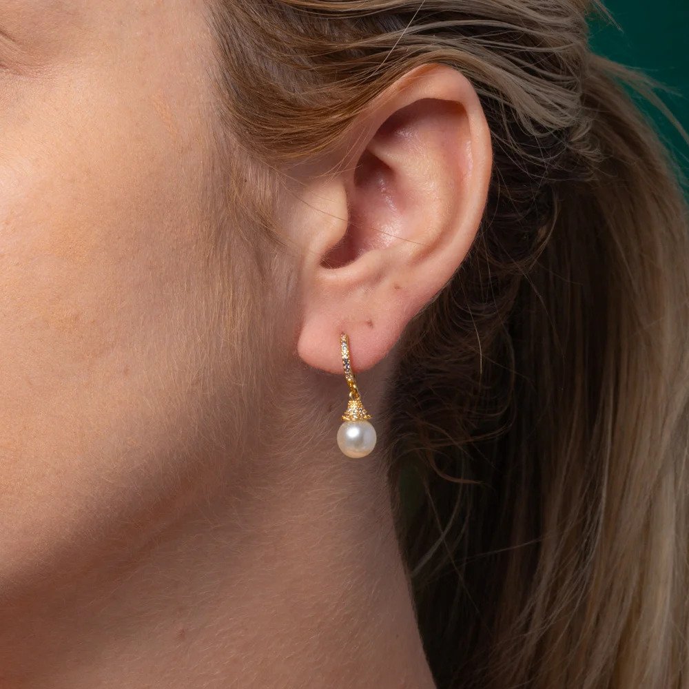 Brinco com design elegante e sofisticado, composto por argola delicada com zircônias cravejadas e pingente de pérola sintética, que traz um toque clássico e atemporal à peça. O detalhe superior com acabamento texturizado e microzircônias valoriza ainda mais o brilho e a sofisticação do conjunto.