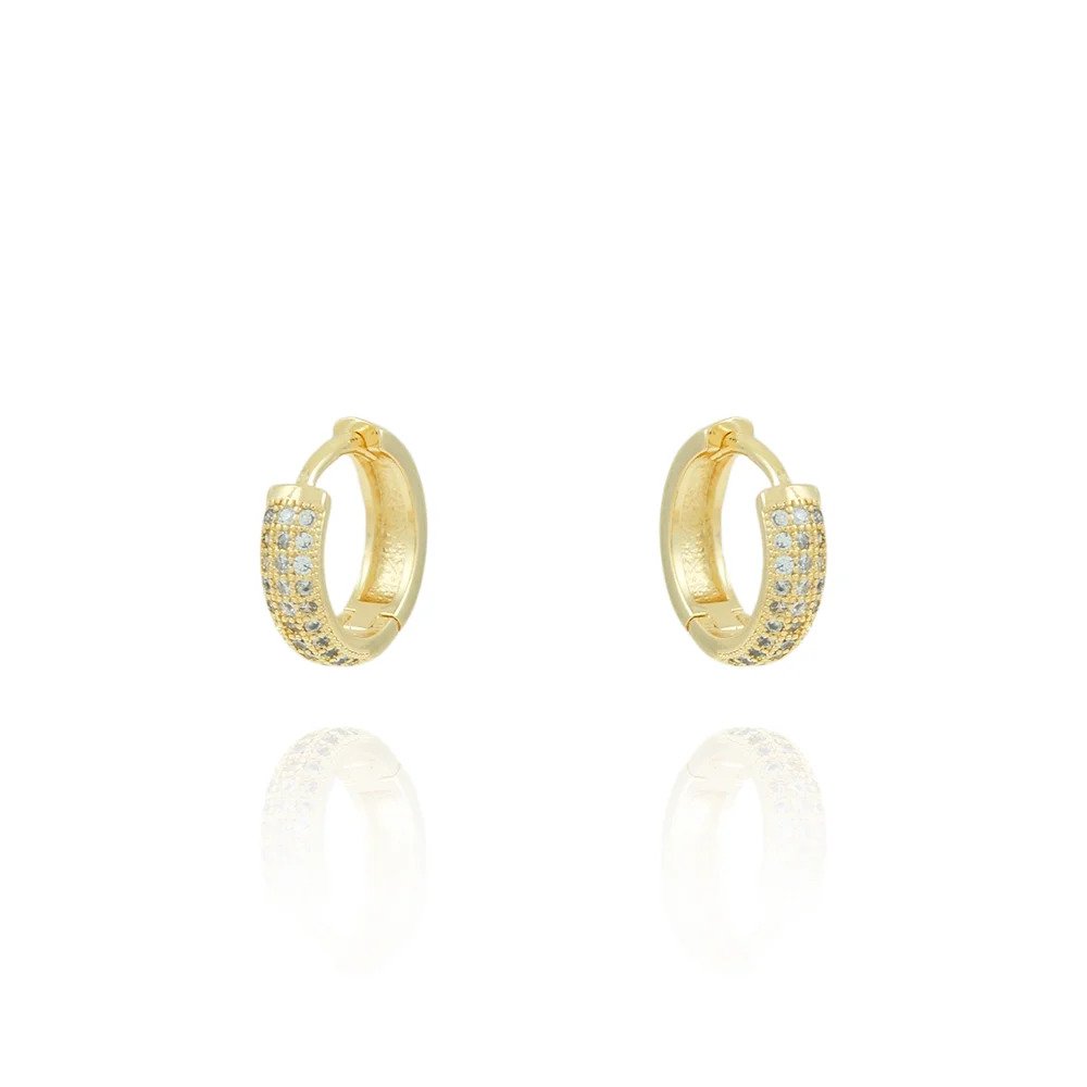 Brinco em formato de argola delicada, com a parte frontal totalmente cravejada por zircônias, proporcionando brilho intenso e sofisticado. O design clássico com acabamento liso na parte interna garante conforto no uso diário, enquanto o brilho das pedras valoriza qualquer produção.