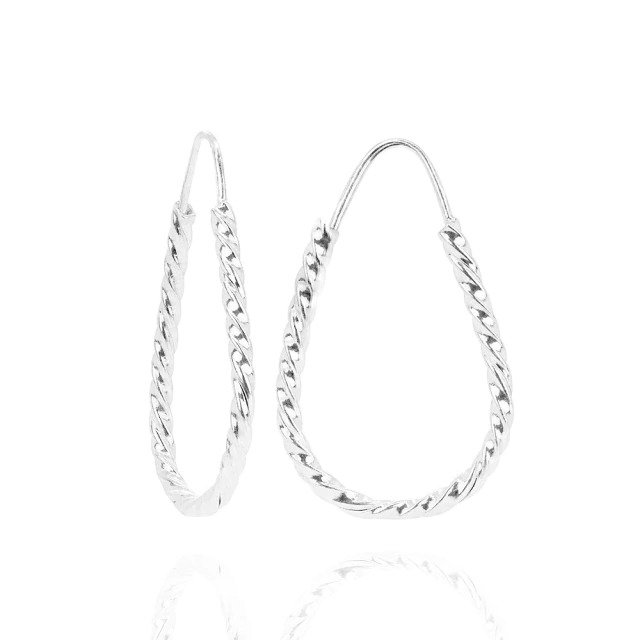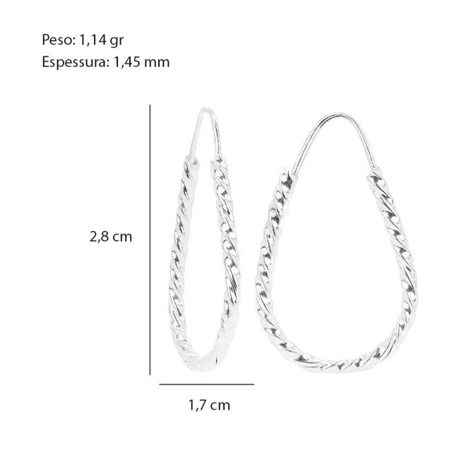 Brinco em formato de argola torcida, com acabamento delicado que reflete a luz de forma sutil e sofisticada. O design leve e alongado traz movimento ao visual, sendo uma peça versátil para o dia a dia ou composições mais elegantes.