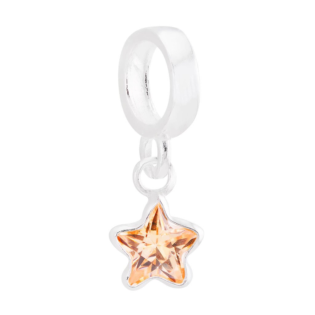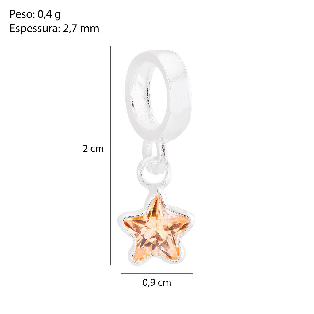 Berloque em Prata 925 com Zircônia Champagne em Formato de Estrela, uma joia delicada e cheia de brilho. A zircônia em tom champagne lapidada em formato de estrela reflete a luz de forma elegante, trazendo um visual sofisticado, moderno e ao mesmo tempo delicado para a pulseira.