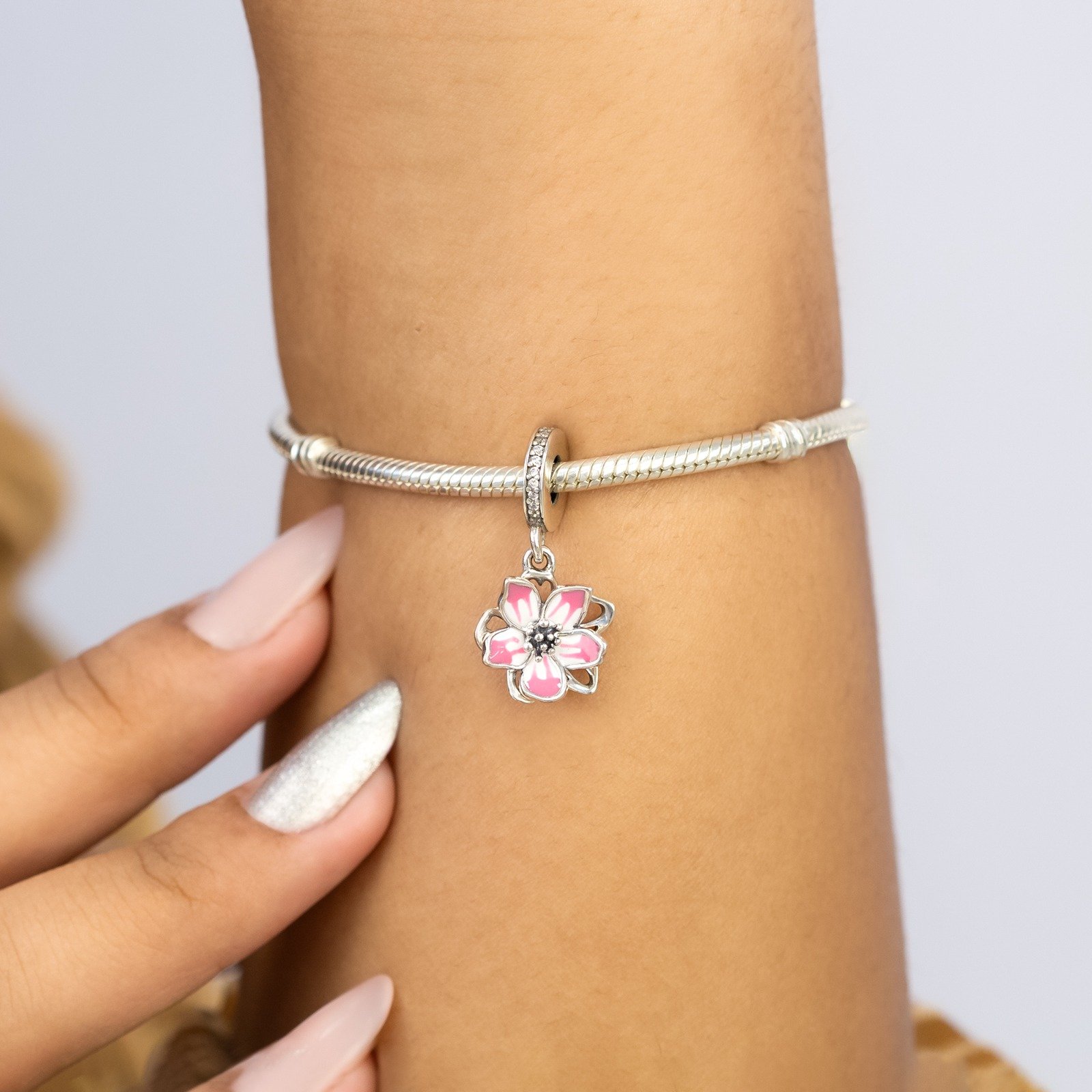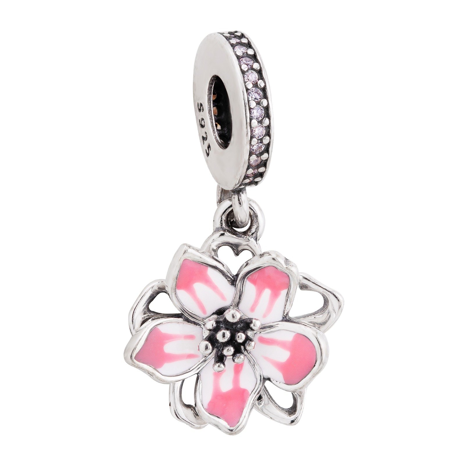 Berloque Flor Rosa Esmaltada com Zircônias Prata 925. Berloque delicado em Prata 925 com design de flor esmaltada em tom rosa suave, trazendo um visual romântico e feminino. O passador é adornado com zircônias cravejadas, que acrescentam brilho elegante e valorizam ainda mais a peça.