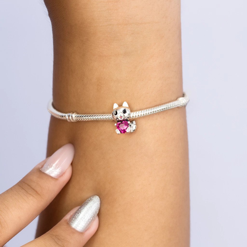 Berloque em Prata 925 Gatinho com Coração em Zircônia, uma joia encantadora e cheia de ternura. O design traz um gatinho delicado segurando um coração em zircônia rosa vibrante, simbolizando amor, carinho e conexão. Uma peça fofa e expressiva, perfeita para quem ama gatos ou quer representar sentimentos especiais.