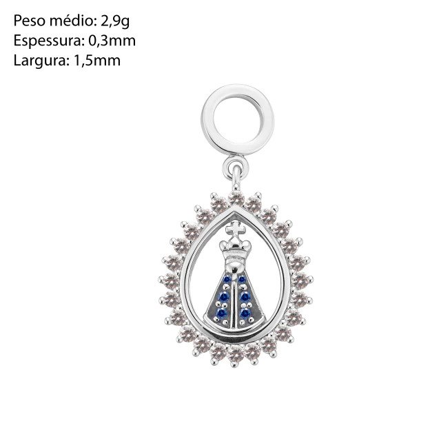 Berloque Nossa Senhora Aparecida Prata 925 com Zircônias Azuis. Berloque delicado e cheio de significado, com a imagem de Nossa Senhora Aparecida em Prata 925, enriquecida por zircônias azuis que simbolizam fé, proteção e serenidade. O contorno com zircônias claras adiciona brilho e elegância, tornando a peça ainda mais especial.