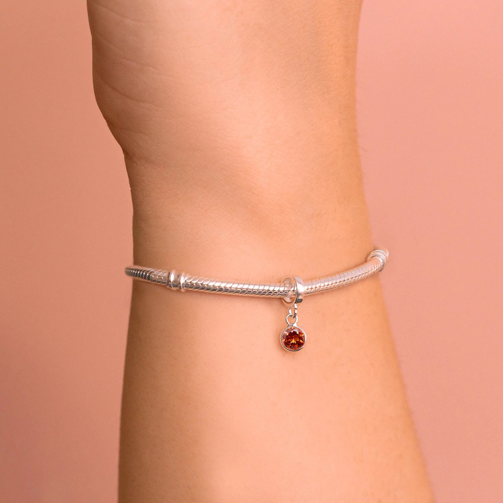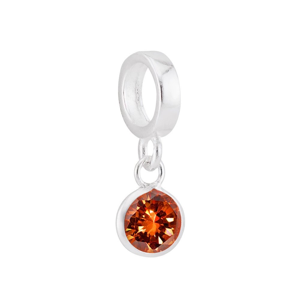 Berloque em Prata 925 com Zircônia Laranja Redonda, uma joia vibrante e cheia de personalidade. A zircônia laranja lapidada reflete a luz com intensidade e brilho marcante, trazendo um toque moderno e energético para composições autênticas e cheias de estilo.