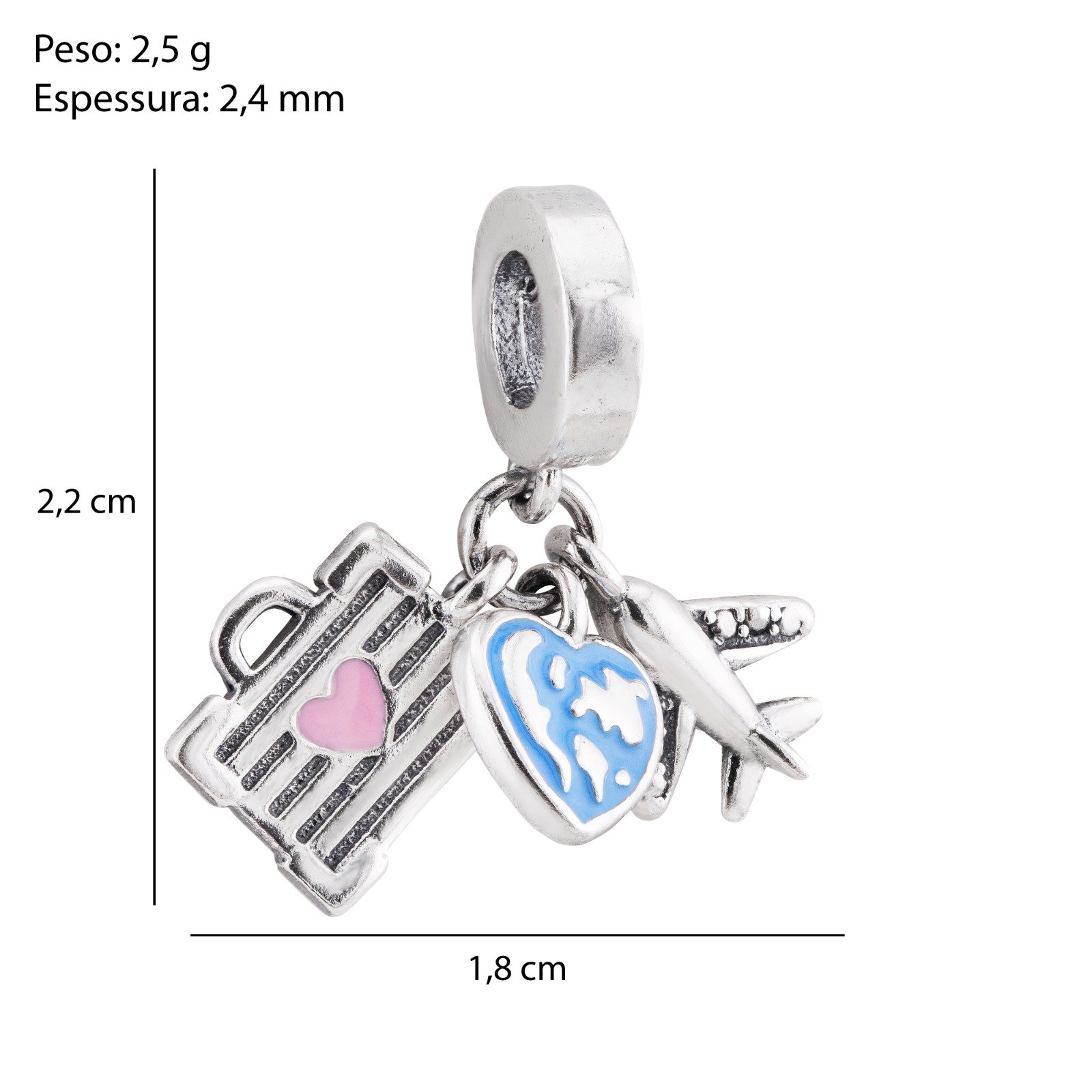 Berloque em Prata 925 Viagem com Mala, Coração e Avião, uma joia cheia de significado para quem ama explorar o mundo. O design reúne três pingentes delicados — uma mala com coração, um coração com detalhe esmaltado e um avião — simbolizando amor por viajar, novas experiências e memórias inesquecíveis.