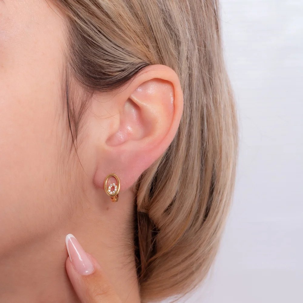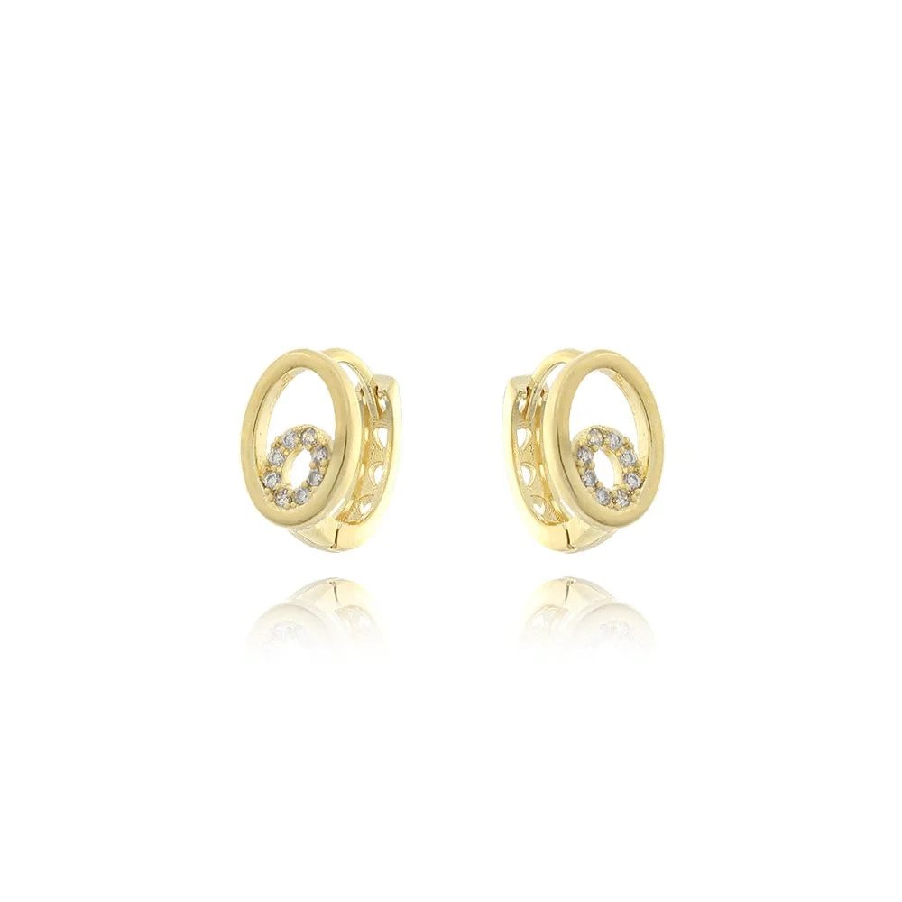 Brinco em formato de argola delicada, com detalhe frontal de círculo vazado cravejado com zircônias, que traz um brilho sutil e sofisticado à peça. O design moderno combina linhas suaves com um toque clássico, ideal para quem busca elegância no dia a dia.