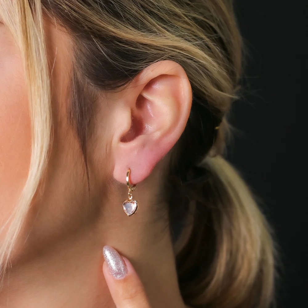 Brinco modelo argola delicada, confeccionado em semi joia dourada com banho em ouro 18K. Possui pingente em formato de coração, com pedra central lapidada que proporciona brilho suave e um visual romântico e elegante.