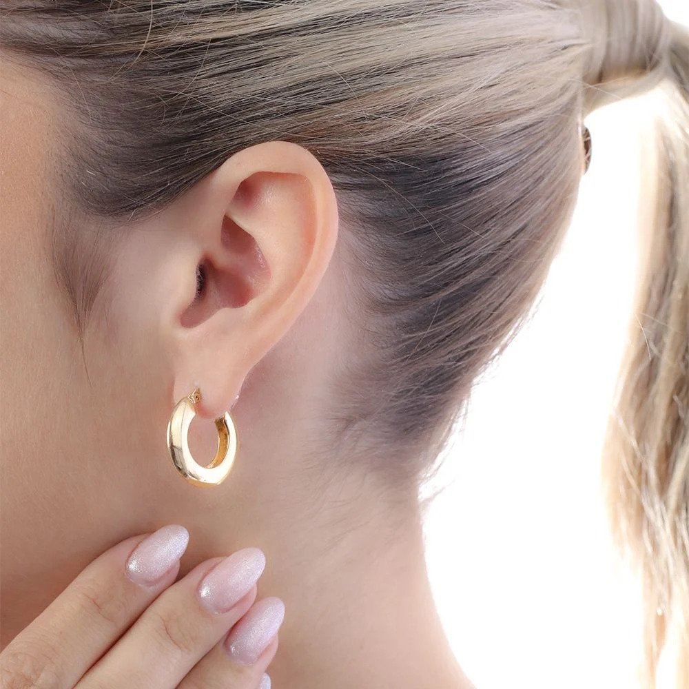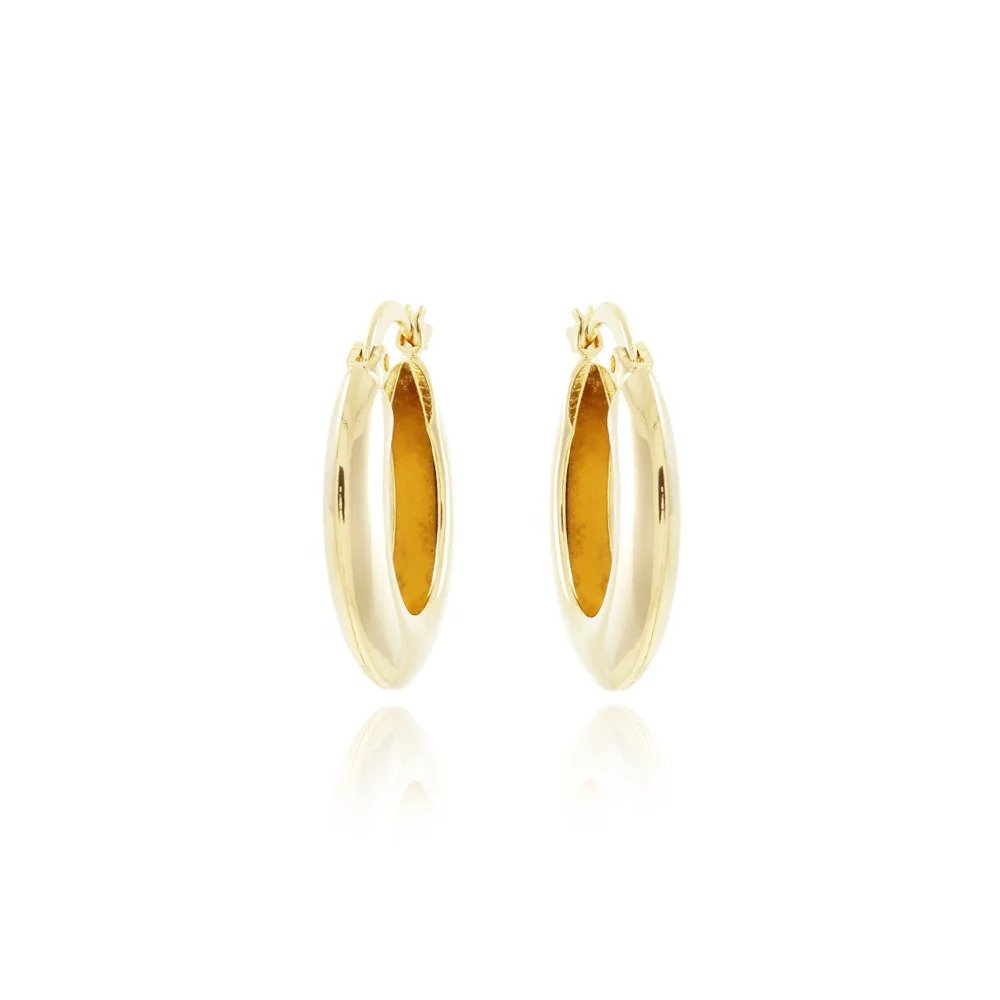 Brinco modelo argola lisa, confeccionado em semi joia dourada com banho em ouro 18K. Possui acabamento polido, que garante brilho intenso e um visual sofisticado e elegante.
