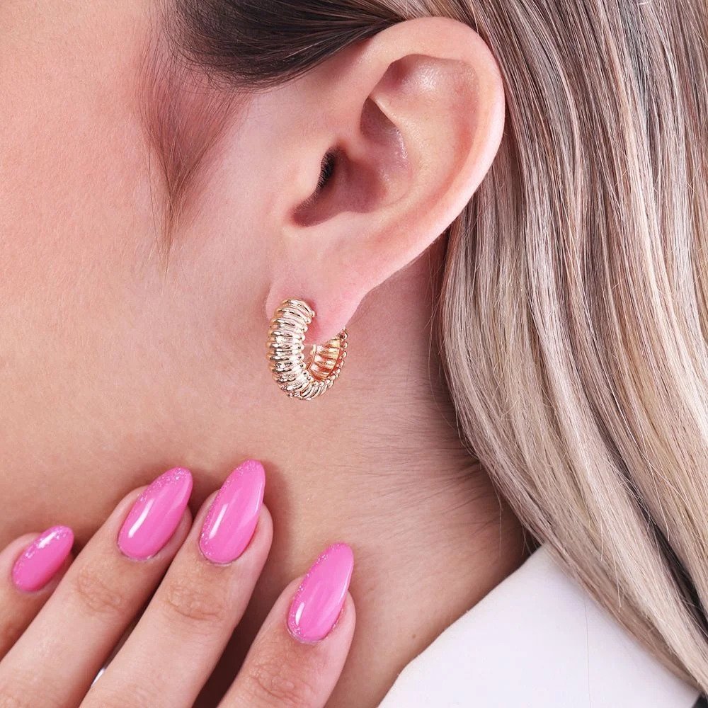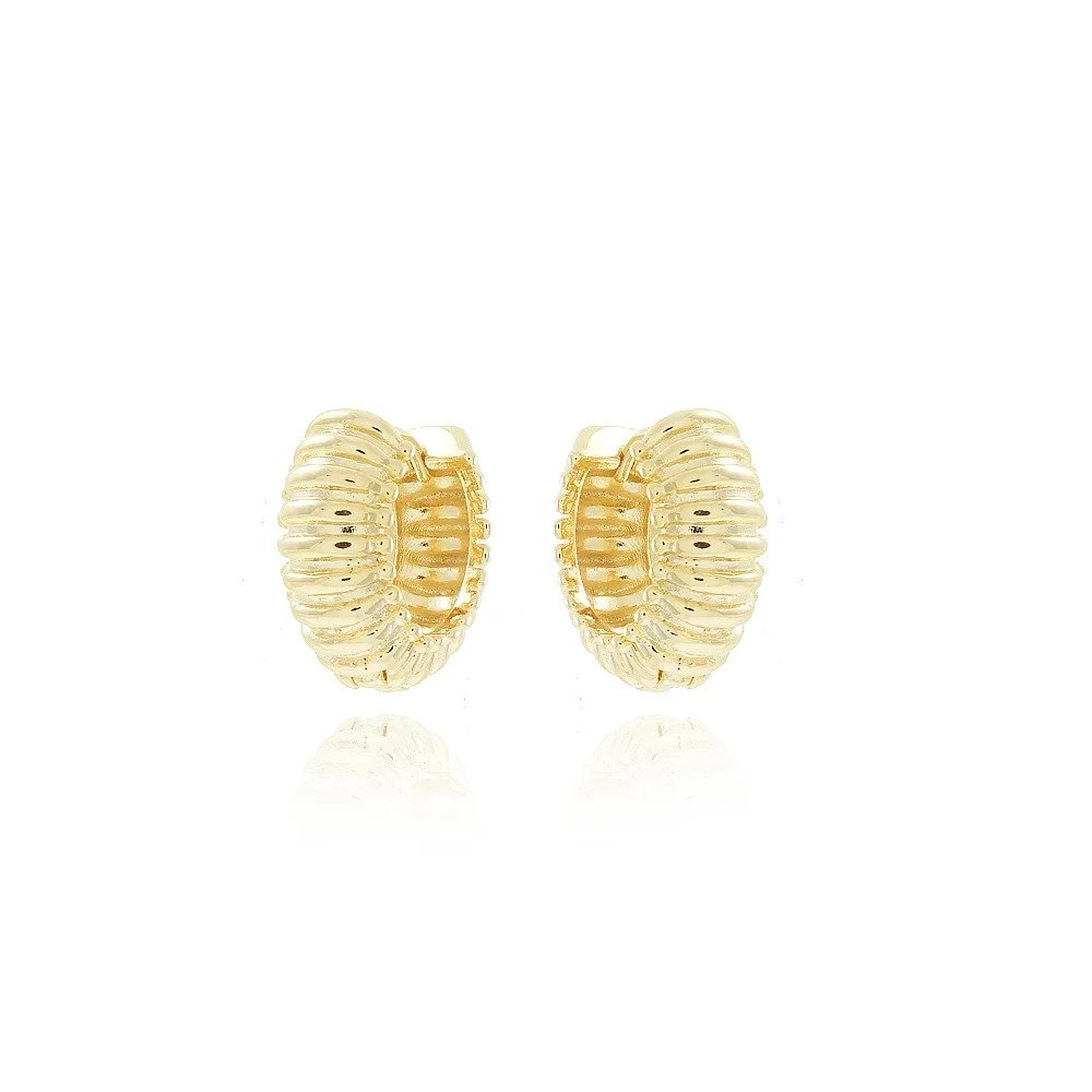 Brinco estilo argola com design volumoso e textura canelada, confeccionado em semi joia com banho dourado 18K. O acabamento polido realça o brilho intenso da peça, enquanto o relevo marcado traz sofisticação e um visual elegante, ideal para quem gosta de joias clássicas com presença.
