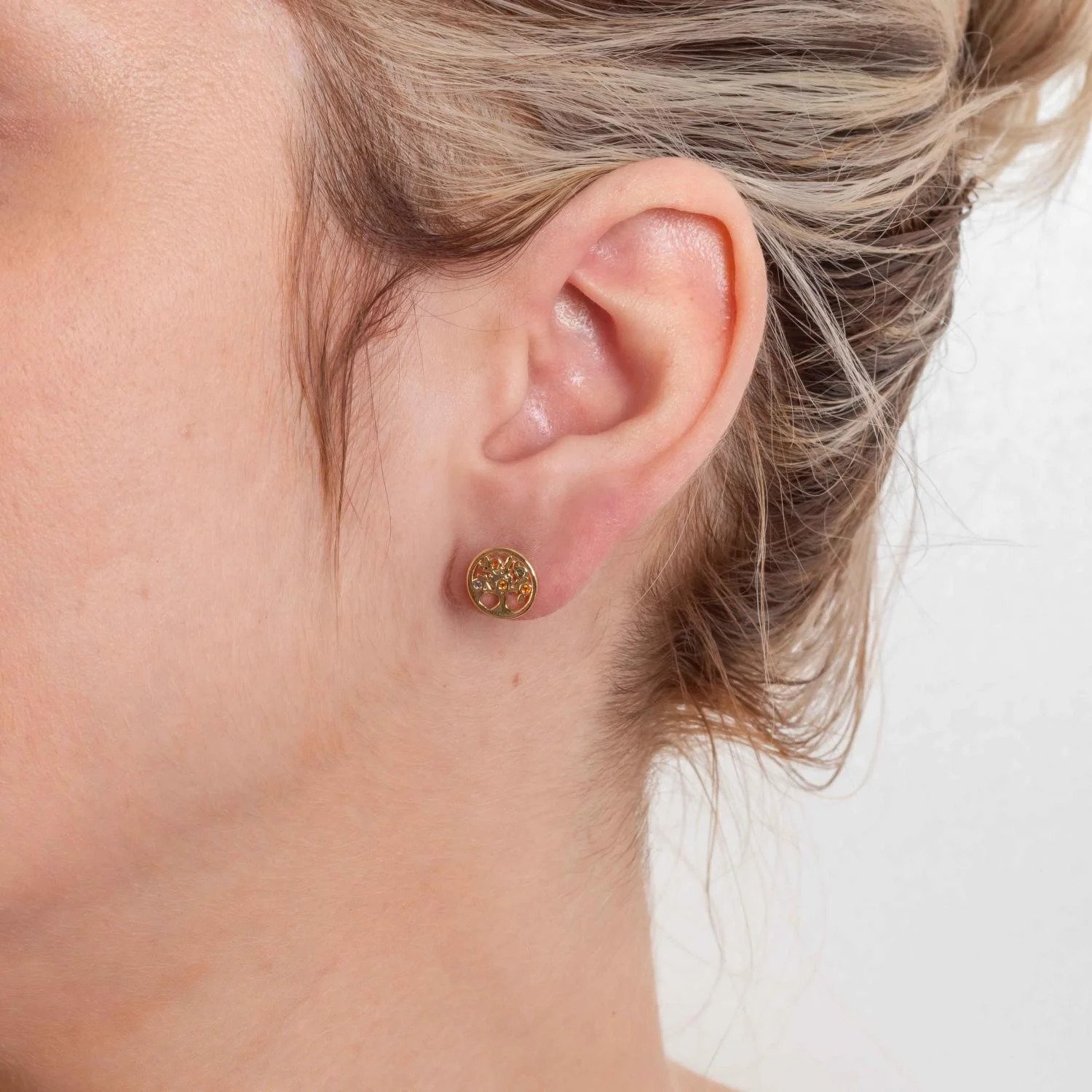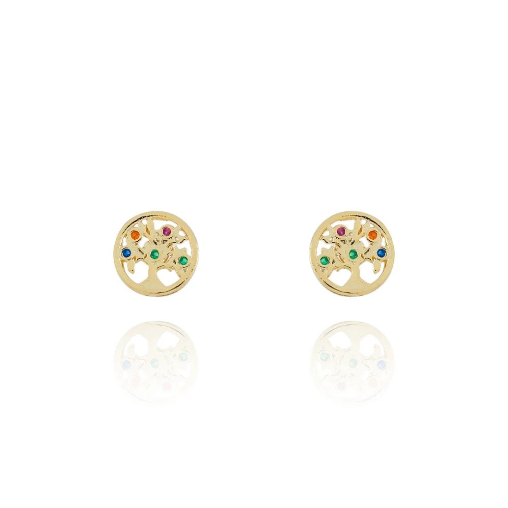 Brinco delicado em formato redondo, com Árvore da Vida vazada e zircônias coloridas aplicadas, trazendo significado, cor e brilho na medida certa. Uma peça leve e versátil, perfeita para o dia a dia ou para composições delicadas.