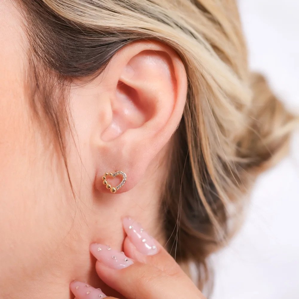 Brinco delicado em formato de coração vazado, com design moderno e romântico. Um dos lados é adornado por zircônias cravejadas, proporcionando brilho sutil e elegante, enquanto o outro lado apresenta esferas polidas que adicionam textura e um toque contemporâneo à peça.