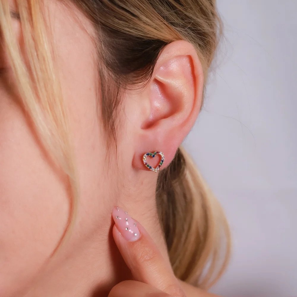 Brinco em formato de coração vazado, com todo o contorno cravejado por zircônias coloridas, que trazem um visual alegre, moderno e sofisticado. A combinação de cores adiciona personalidade à peça, enquanto o design delicado mantém a elegância e a leveza no uso.