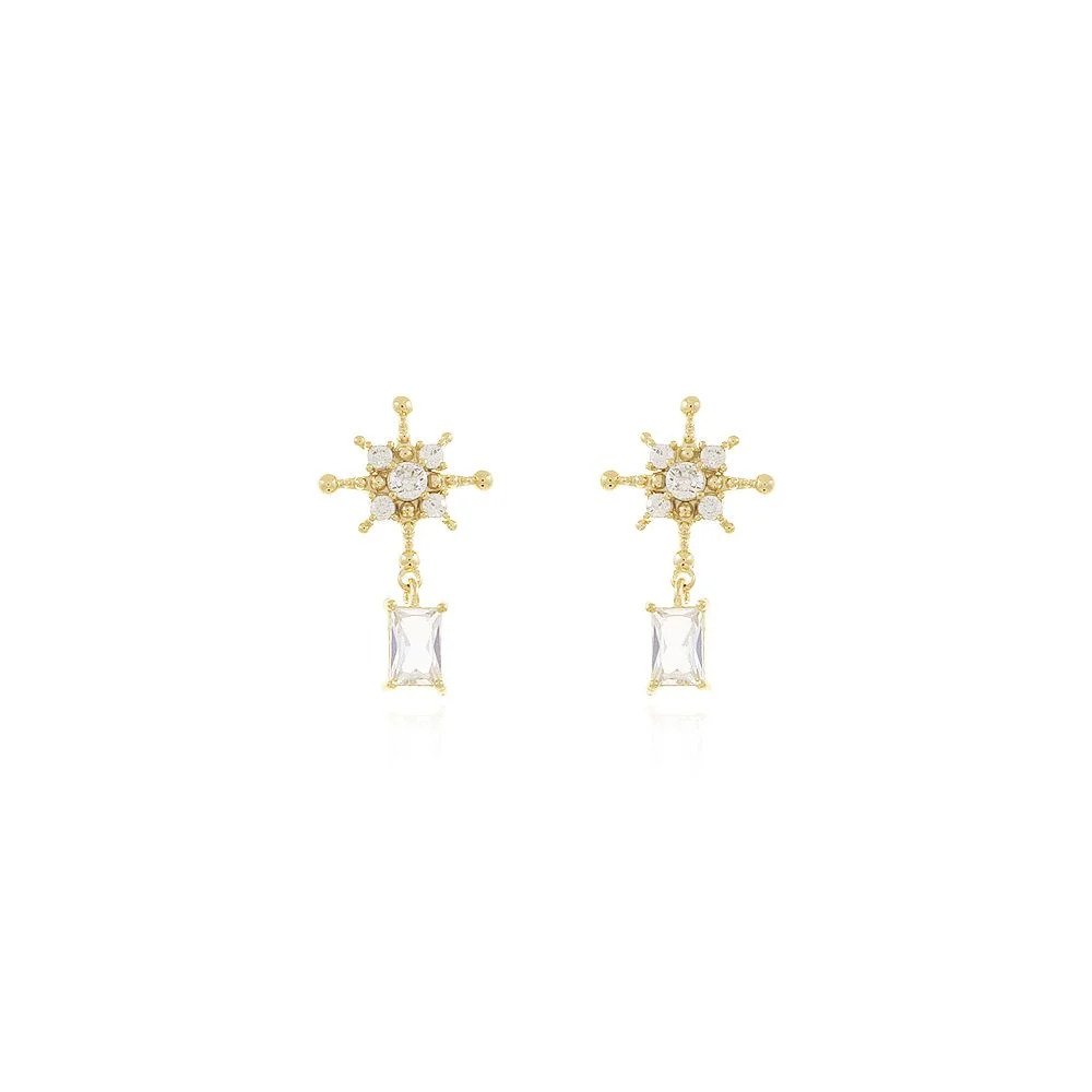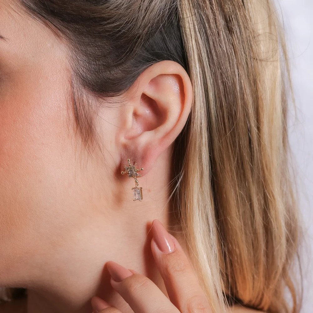Brinco delicado com design em formato de estrela, todo cravejado com zircônias que proporcionam brilho elegante e sofisticado. O modelo conta com um pingente inferior em zircônia de formato retangular, criando um visual moderno e equilibrado, com leve movimento que valoriza a peça.
