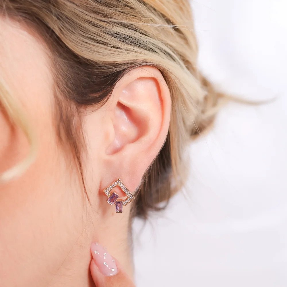 Brinco moderno em formato quadrado vazado, com contorno cravejado por zircônias que garantem brilho elegante e sofisticado. O destaque fica para as zircônias retangulares em tom rosado, aplicadas de forma assimétrica, trazendo um design contemporâneo e cheio de personalidade.