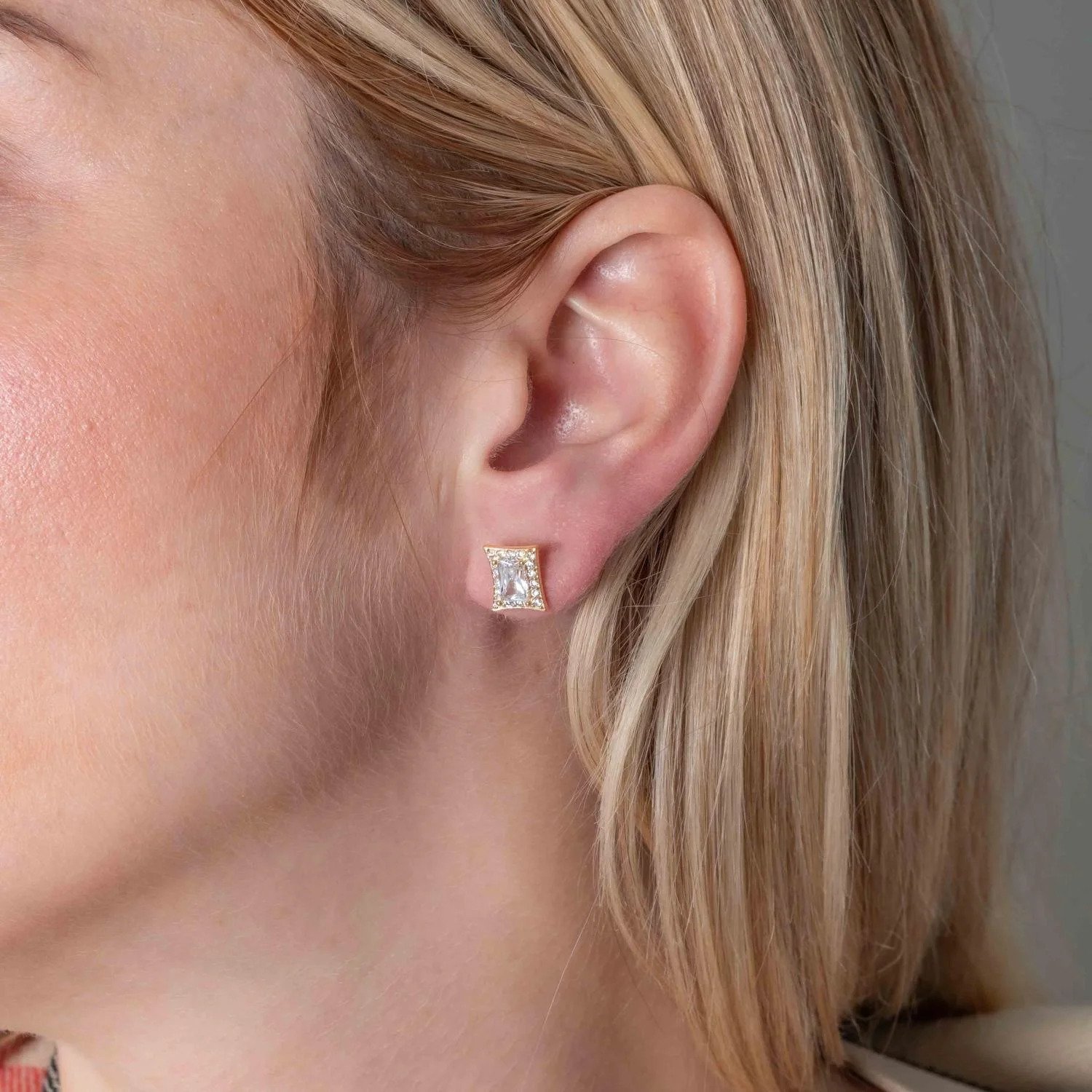 Brinco em formato quadrado com design moderno e sofisticado, apresentando zircônia central em lapidação retangular, emoldurada por delicada cravação de zircônias ao redor. O formato geométrico traz elegância contemporânea e brilho na medida certa.