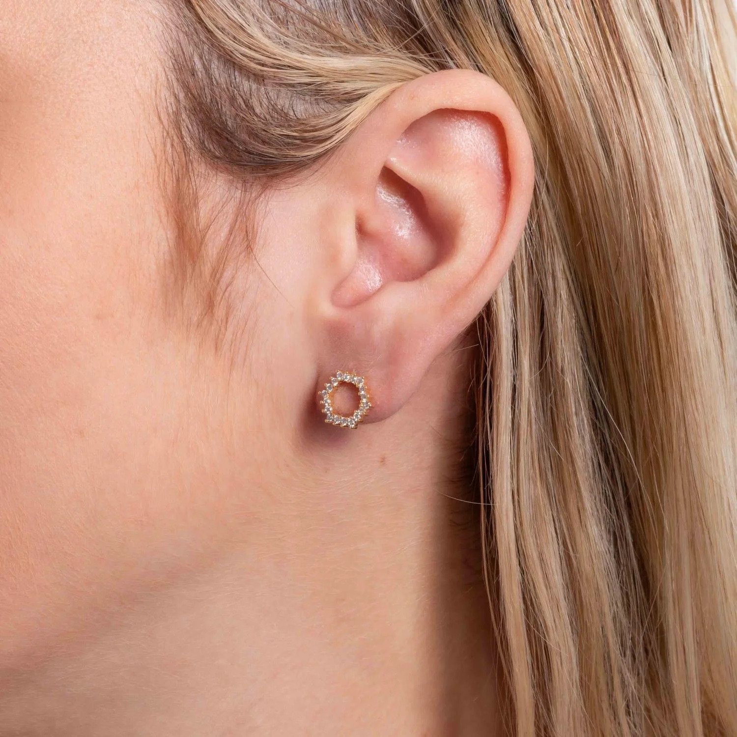 Brinco em formato redondo vazado, com zircônias cravejadas ao redor, formando um visual delicado e elegante. O design clássico com brilho suave torna a peça versátil, ideal para o uso diário ou para compor looks mais refinados.