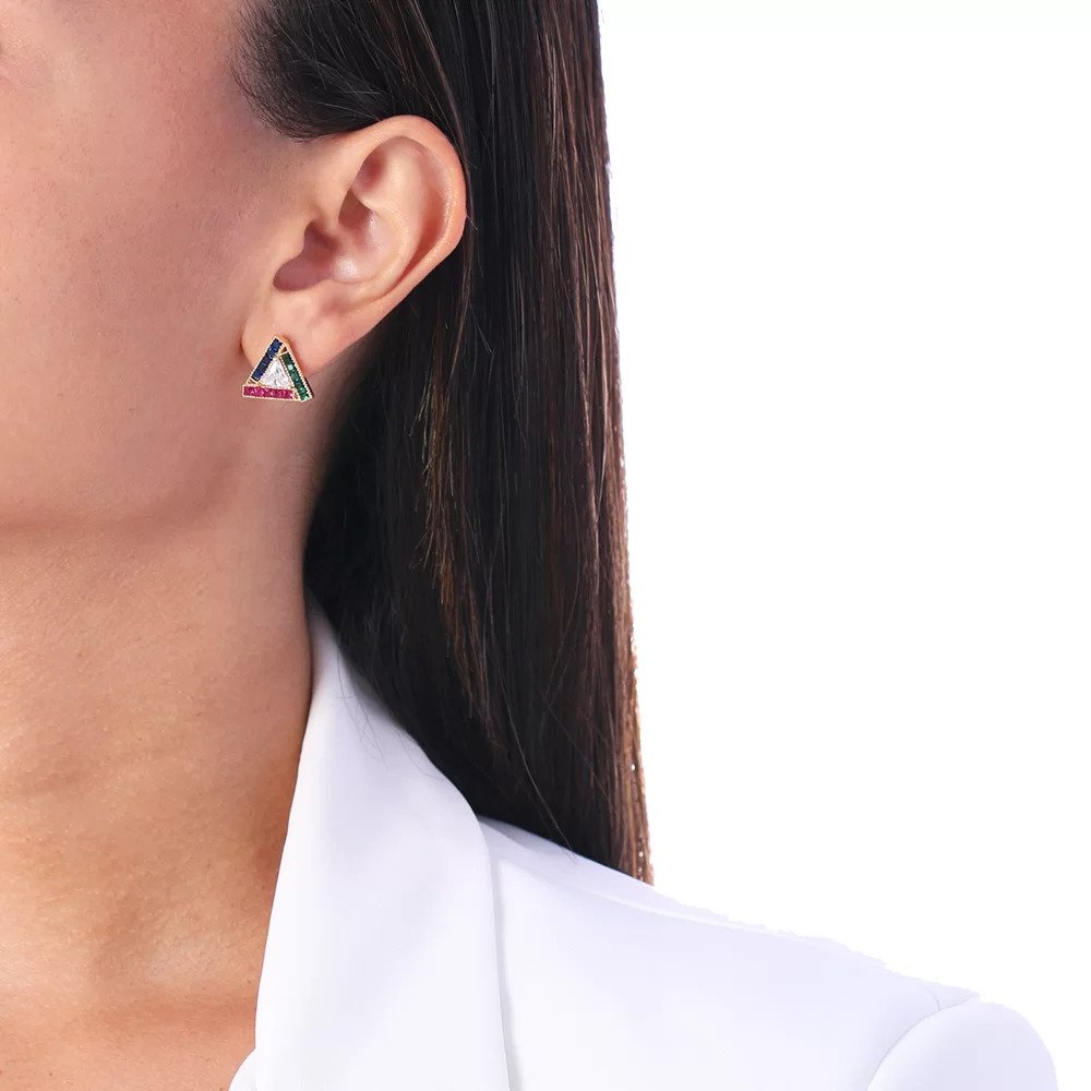 Brinco Triangular com Zircônias Coloridas – Semi Joia Dourada 18K