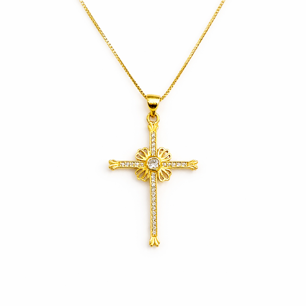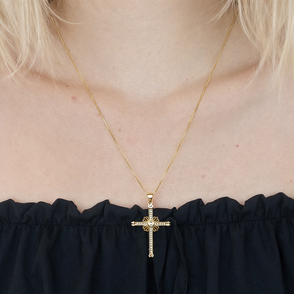 Colar de design elegante e simbólico, com pingente de cruz ornamental que une delicadeza, brilho sutil e um toque clássico à peça. Seu visual refinado, com detalhes vazados e aplicação de pedras, faz dele uma excelente escolha para quem busca um acessório feminino, marcante e cheio de significado.