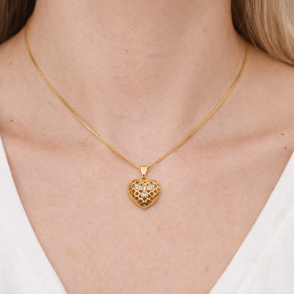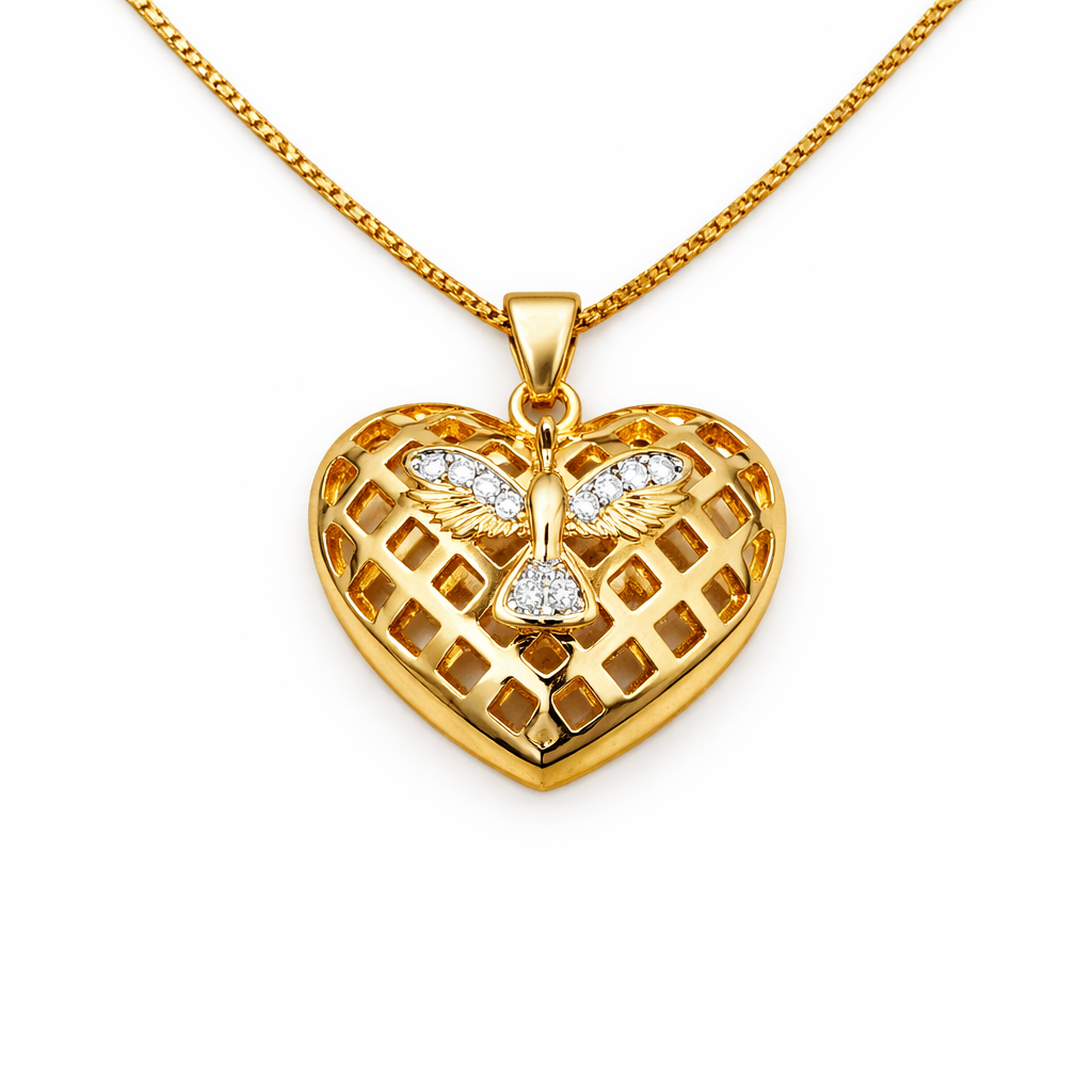Colar de presença delicada e simbólica, com pingente em formato de coração trabalhado e detalhe central de anjo com zircônias. A composição une brilho, significado e um visual ornamental que chama atenção de forma elegante.