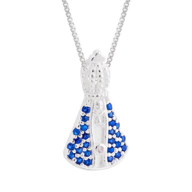 Produzido em Prata 925 legítima, este colar traz um delicado pingente de Nossa Senhora Aparecida, adornado com zircônias azuis e uma zircônia branca, que iluminam o manto e destacam a beleza da peça.