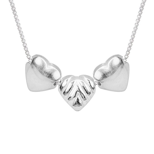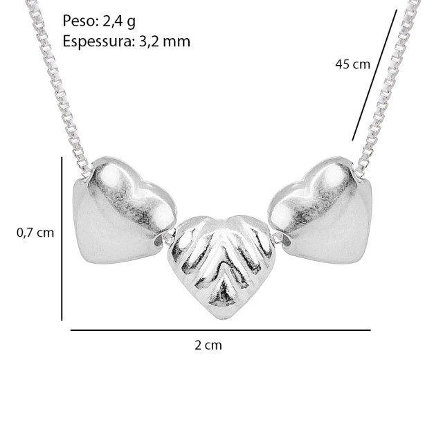 Produzido em Prata 925 legítima, este modelo de 45 cm apresenta três pingentes de coração, sendo o central trabalhado com textura elegante e os laterais lisos e polidos, criando um contraste harmônico e sofisticado.