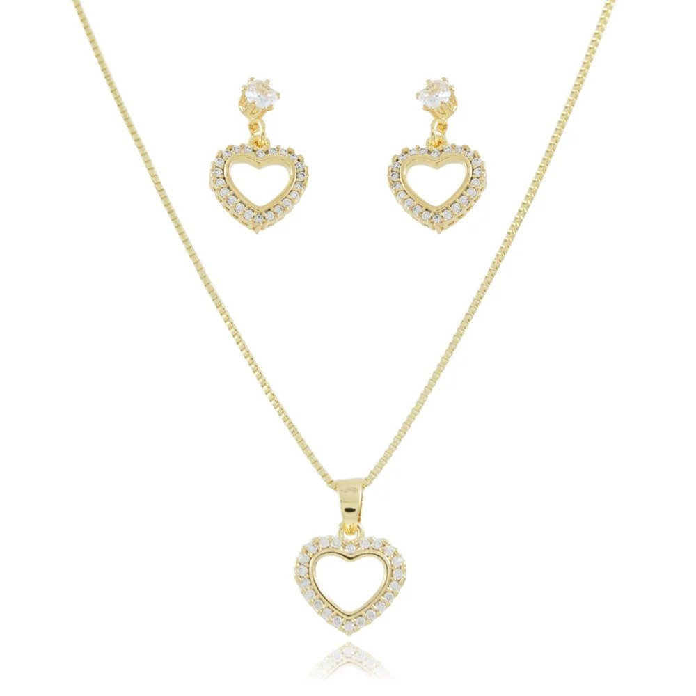 Conjunto Colar e Brincos Coração Vazado com Zircônias – Semi Joia Dourada Banho Ouro 18k