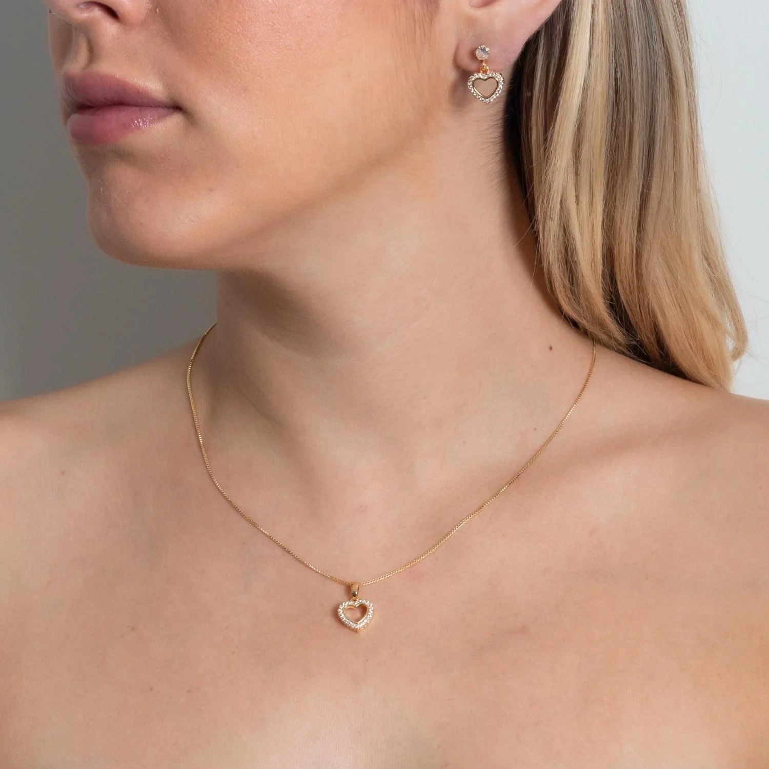 Conjunto confeccionado em semi joia dourada com banho em ouro 18k, composto por colar com pingente em formato de coração vazado, contornado por zircônias cravejadas, e brincos no mesmo design, criando um visual delicado, romântico e sofisticado. O acabamento vazado traz leveza à peça, enquanto as zircônias garantem brilho elegante na medida certa.