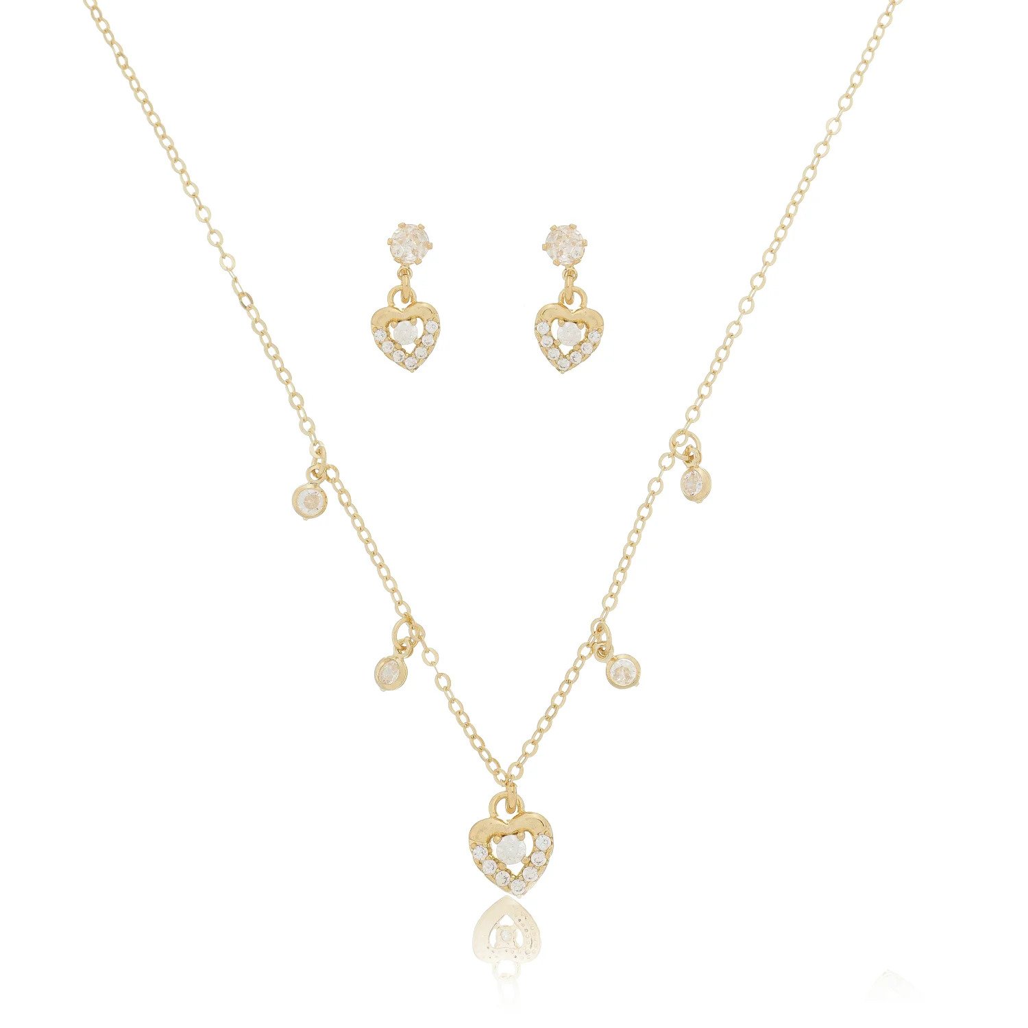 Conjunto Colar e Brincos Coração com Zircônias – Semi Joia Dourada Banho Ouro 18k