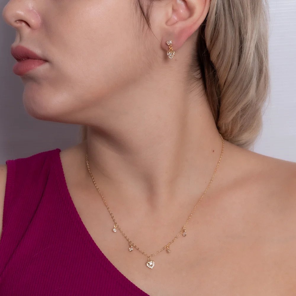 Conjunto confeccionado em semi joia dourada com banho em ouro 18k, composto por colar com corrente delicada adornada por pequenas zircônias pendentes e pingente central em formato de coração, além de brincos no mesmo design, ambos cravejados com zircônias, que proporcionam brilho suave e acabamento romântico. O formato de coração simboliza amor, delicadeza e afeto, tornando a peça encantadora e atemporal.