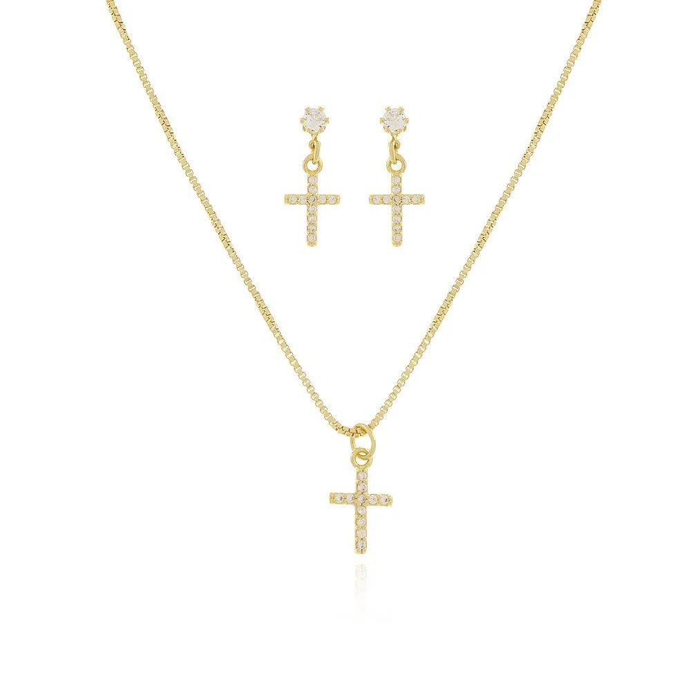 Conjunto Colar e Brincos Cruz com Zircônias – Semi Joia Dourada Banho Ouro 18k