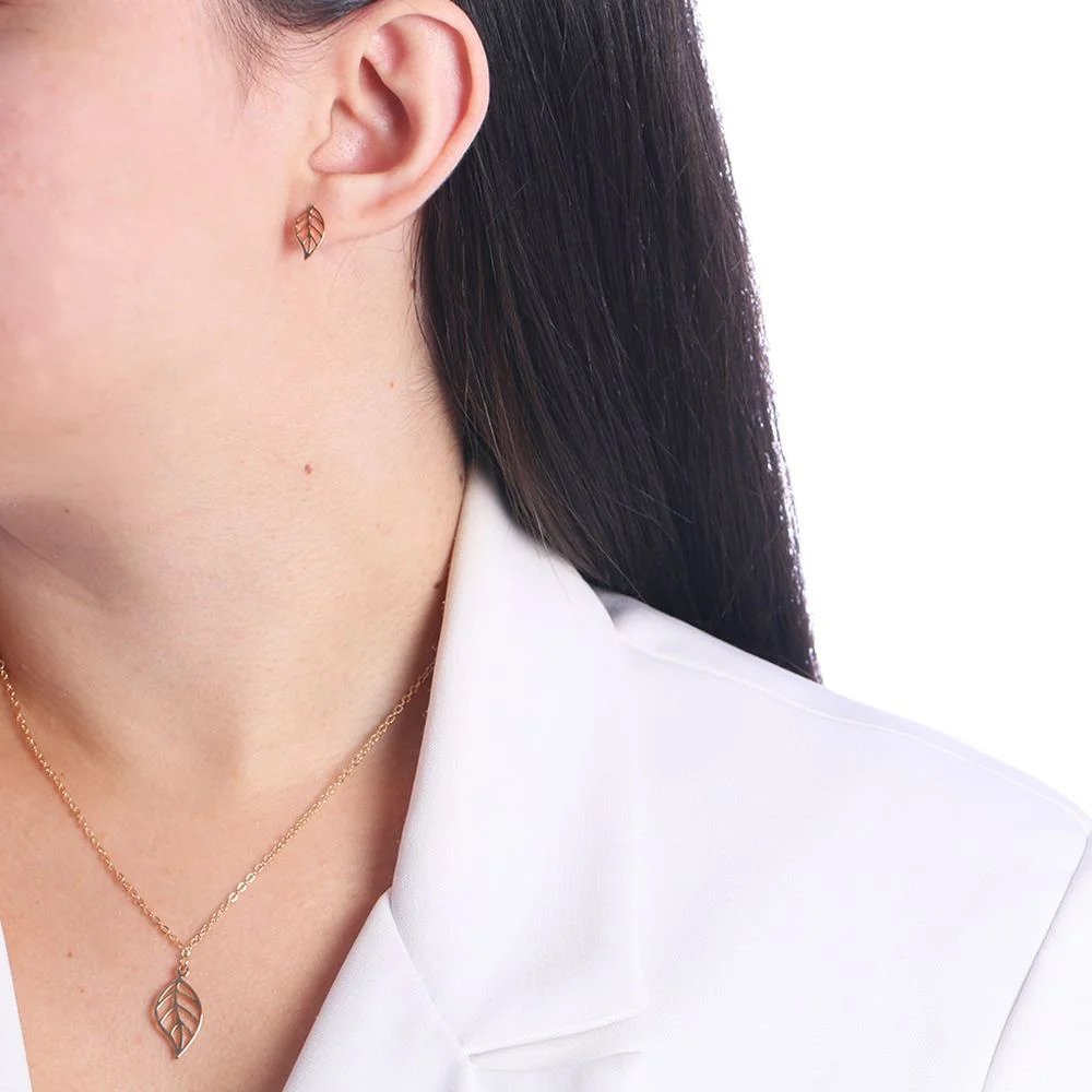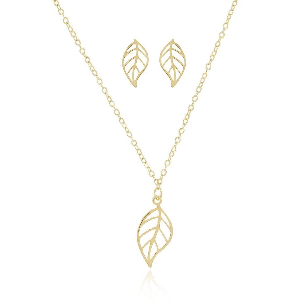 Conjunto Colar e Brincos Folha Semi Joia Dourada – Banho Ouro 18k