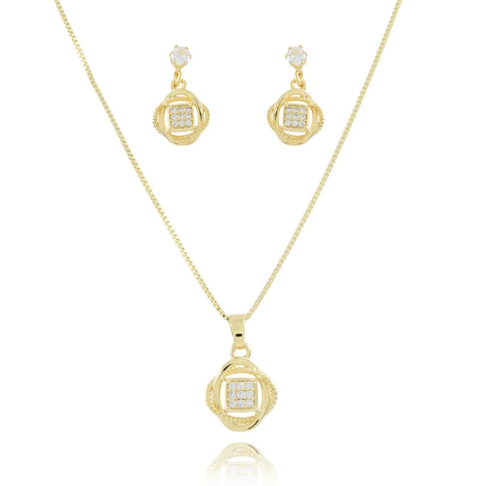 Conjunto Colar e Brincos Geométrico com Zircônias – Semi Joia Dourada Banho Ouro 18k