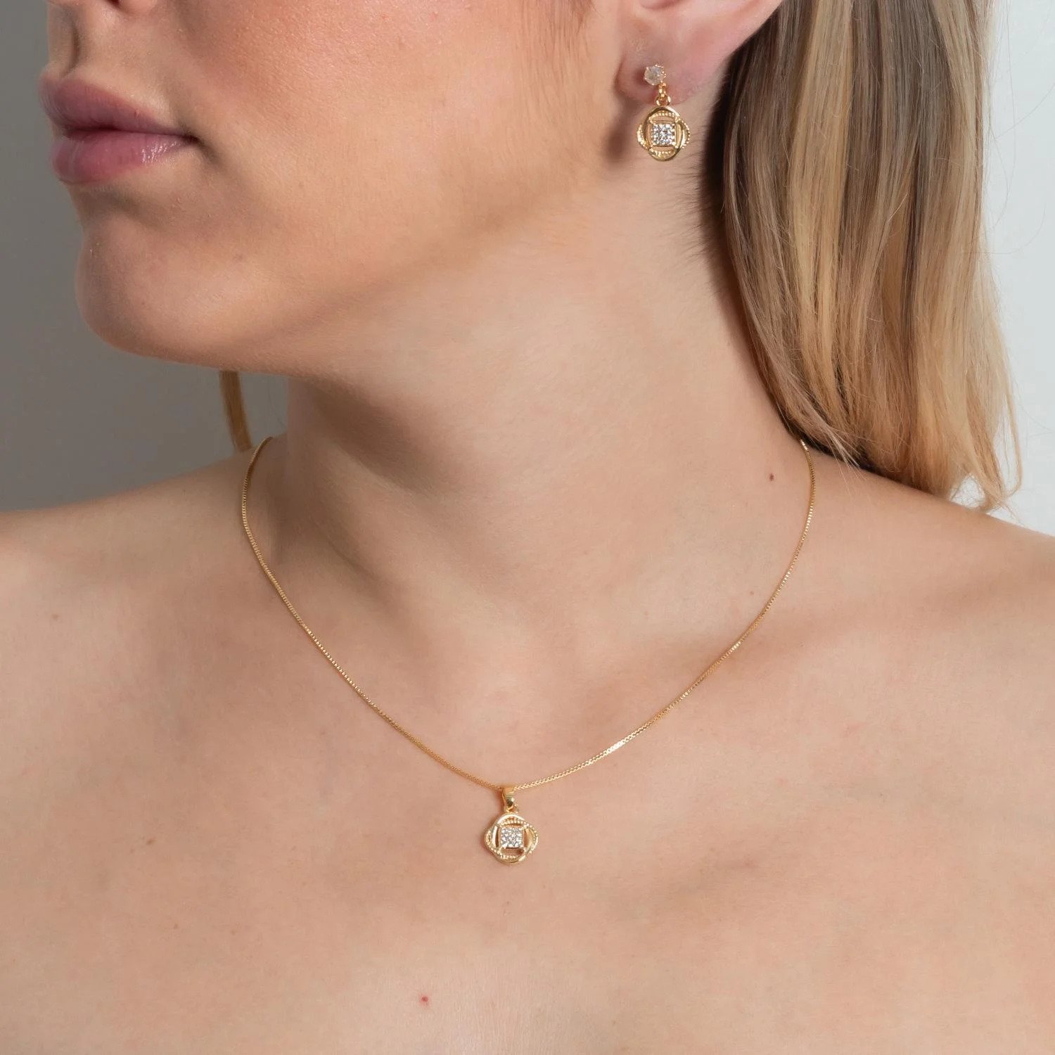 Conjunto confeccionado em semi joia dourada com banho em ouro 18k, composto por colar com pingente de design geométrico, com zircônias cravejadas em formato quadrado no centro, envoltas por uma moldura arredondada com acabamento trabalhado, que traz sofisticação e um toque moderno à peça. Os brincos acompanham o mesmo design, criando harmonia e elegância no conjunto.