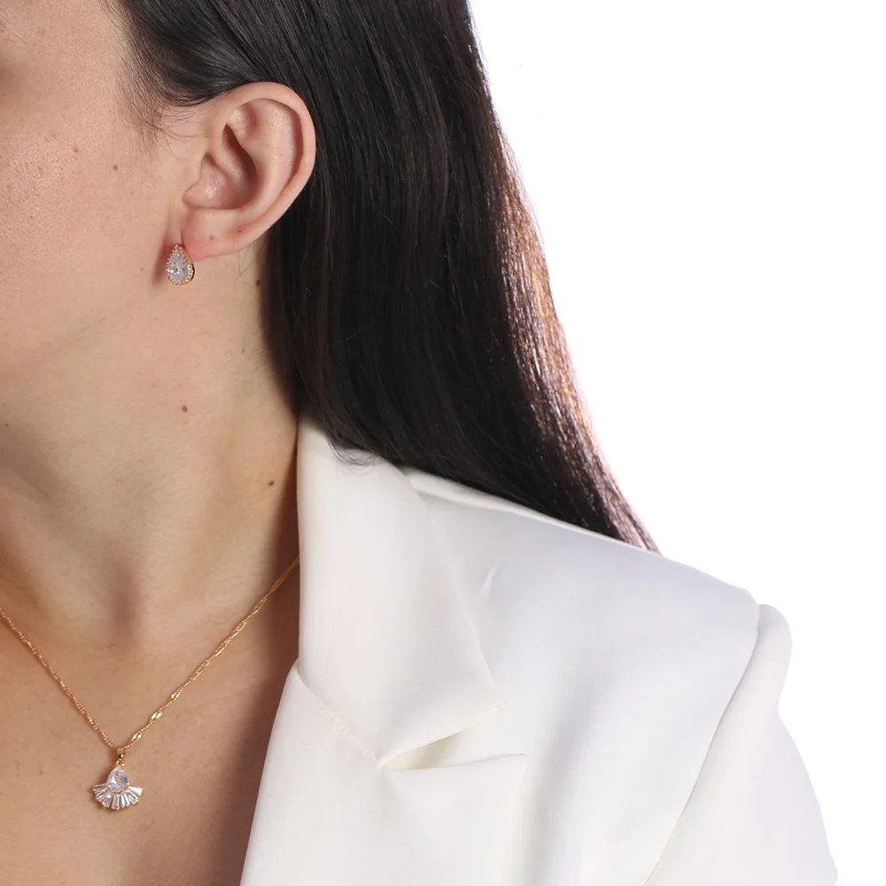 Conjunto confeccionado em semi joia dourada com banho em ouro 18k, composto por colar com pingente em formato de leque, com zircônia central em lapidação gota e zircônias em lapidação baguete, que criam um efeito de brilho intenso e sofisticado. Os brincos em formato de gota complementam o conjunto com delicadeza e elegância.