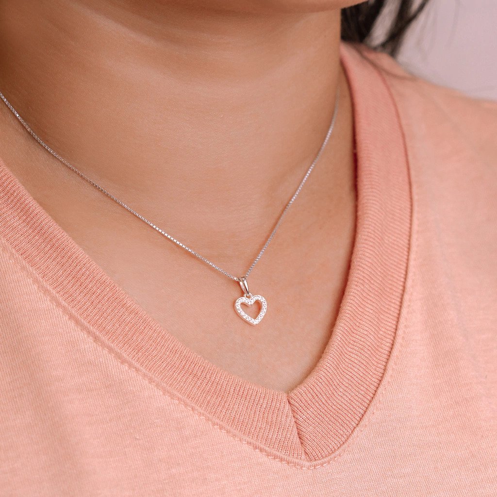 Pingente Coração Vazado com Zircônias em Prata 925. Pingente confeccionado em Prata 925, com design em formato de coração vazado, todo cravejado com delicadas zircônias claras, que proporcionam brilho intenso e sofisticado. O acabamento polido valoriza ainda mais a luminosidade da peça, trazendo leveza e elegância para o visual.