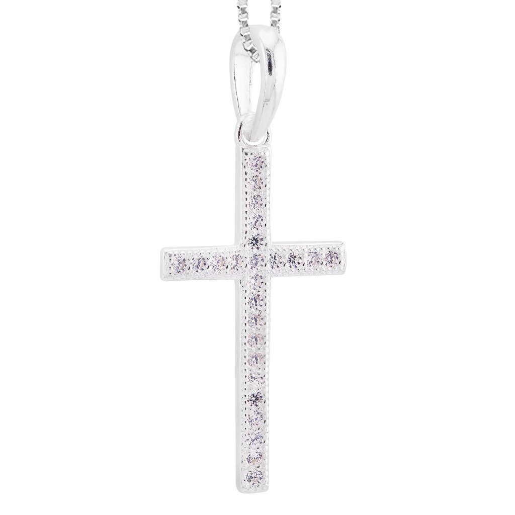 Pingente confeccionado em Prata 925, com design clássico de cruz inteiramente cravejado com zircônias transparentes, que proporcionam brilho intenso e sofisticado. A disposição uniforme das pedras valoriza o formato da cruz, criando um visual elegante, delicado e atemporal, ideal para uso diário ou ocasiões especiais.