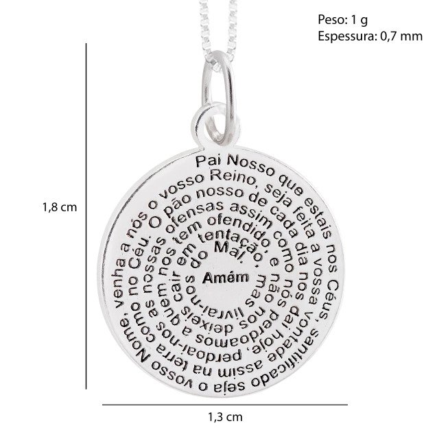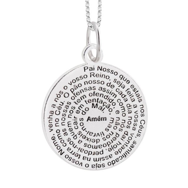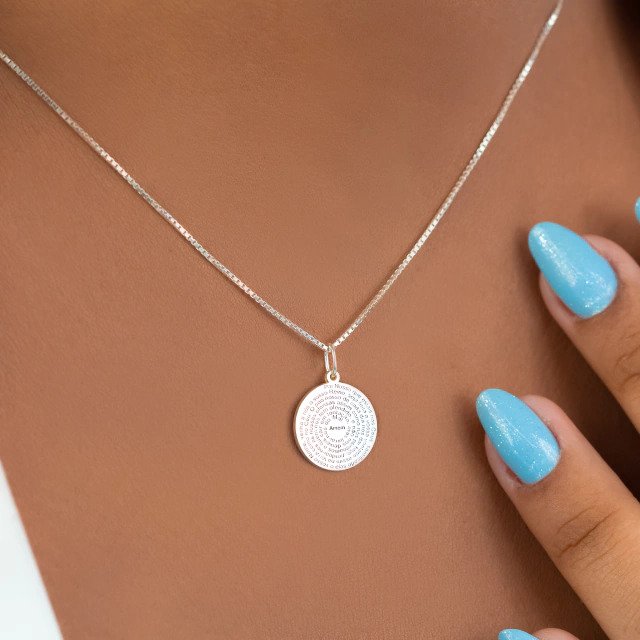 Pingente confeccionado em Prata 925, em formato de medalha, com a oração do Pai Nosso gravada em relevo. O design clássico e religioso transmite fé, proteção e espiritualidade, sendo uma peça atemporal para uso diário ou para presentear em momentos especiais.